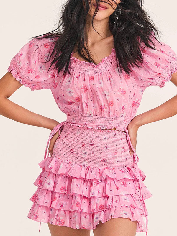 Floral top + ruched cake skirt set